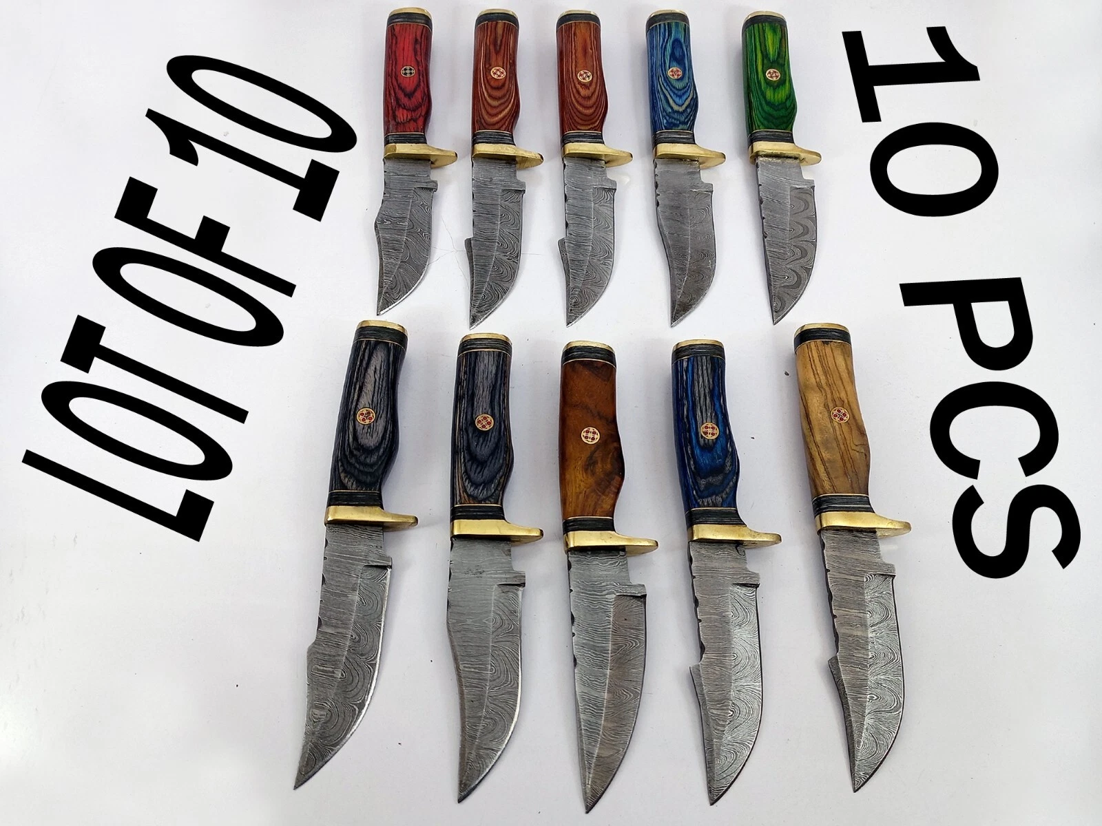 10 pieces Damascus steel fixed blade skinning knives lot with Leather sheath. Over 70 inches long Damascus steel knives in assorted colors