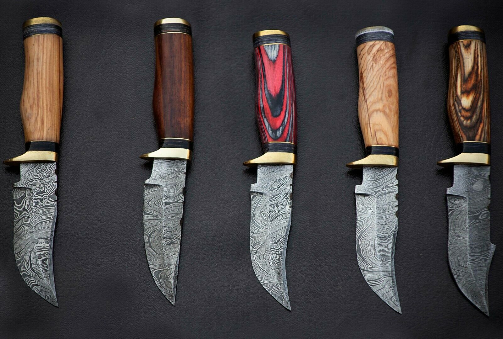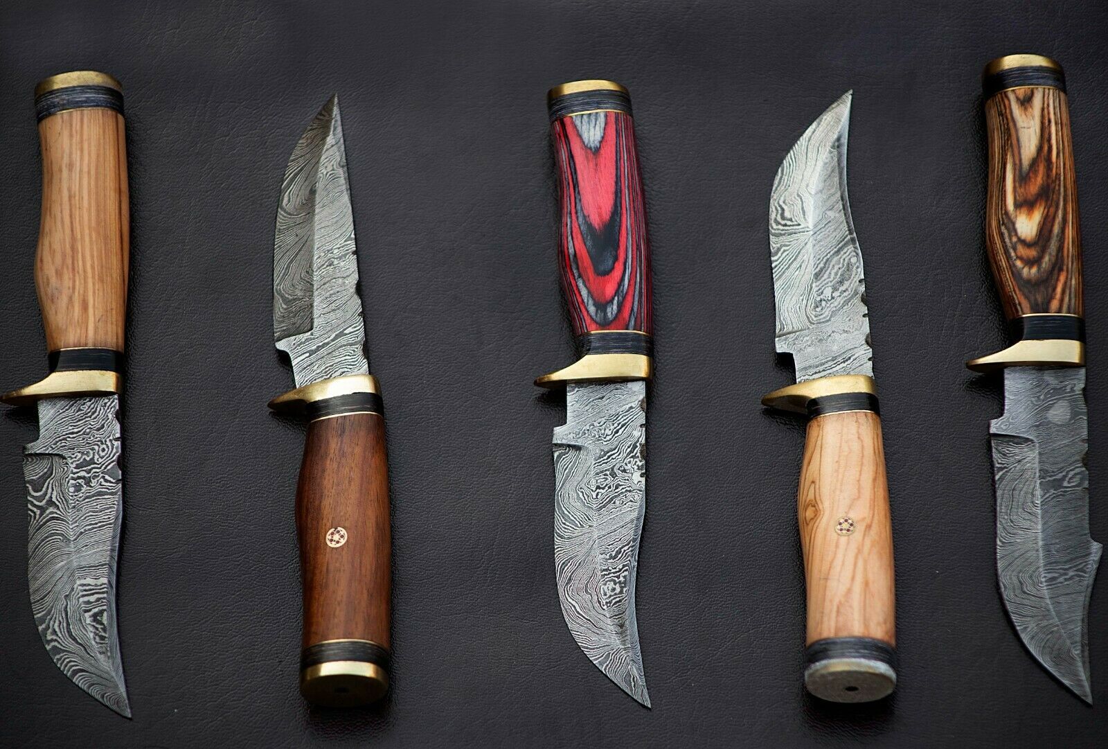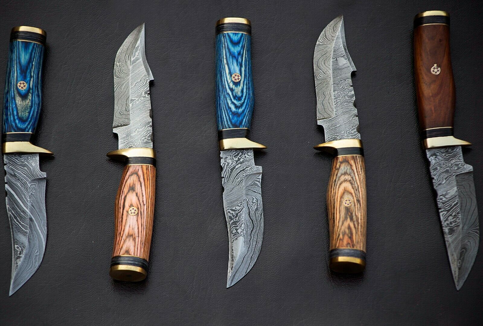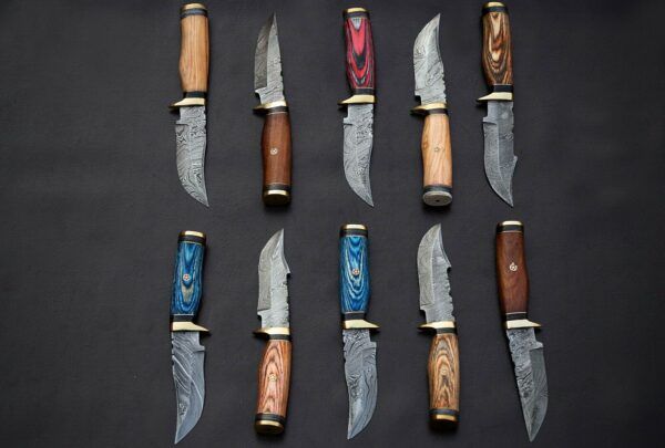 10 pieces Damascus steel fixed blade round scale skinning knives lot with Leather sheath. Over 75 inches long Damascus steel knives in assorted colors