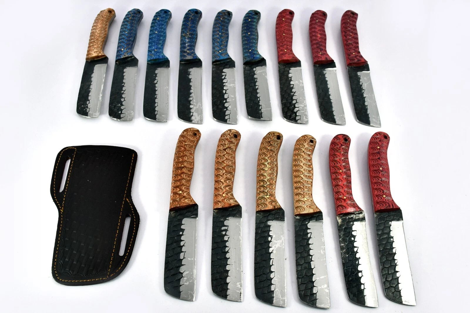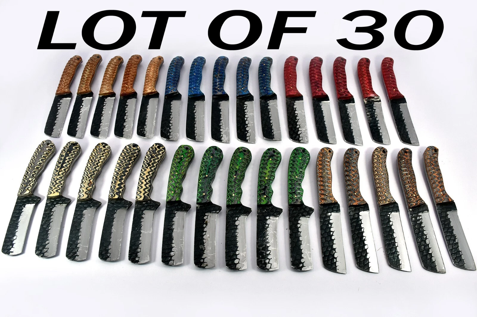30 pieces Damascus steel fixed blade Bull cutter knives lot with Leather sheath. Multi color Jigged Sturl scale, Leather sheath included