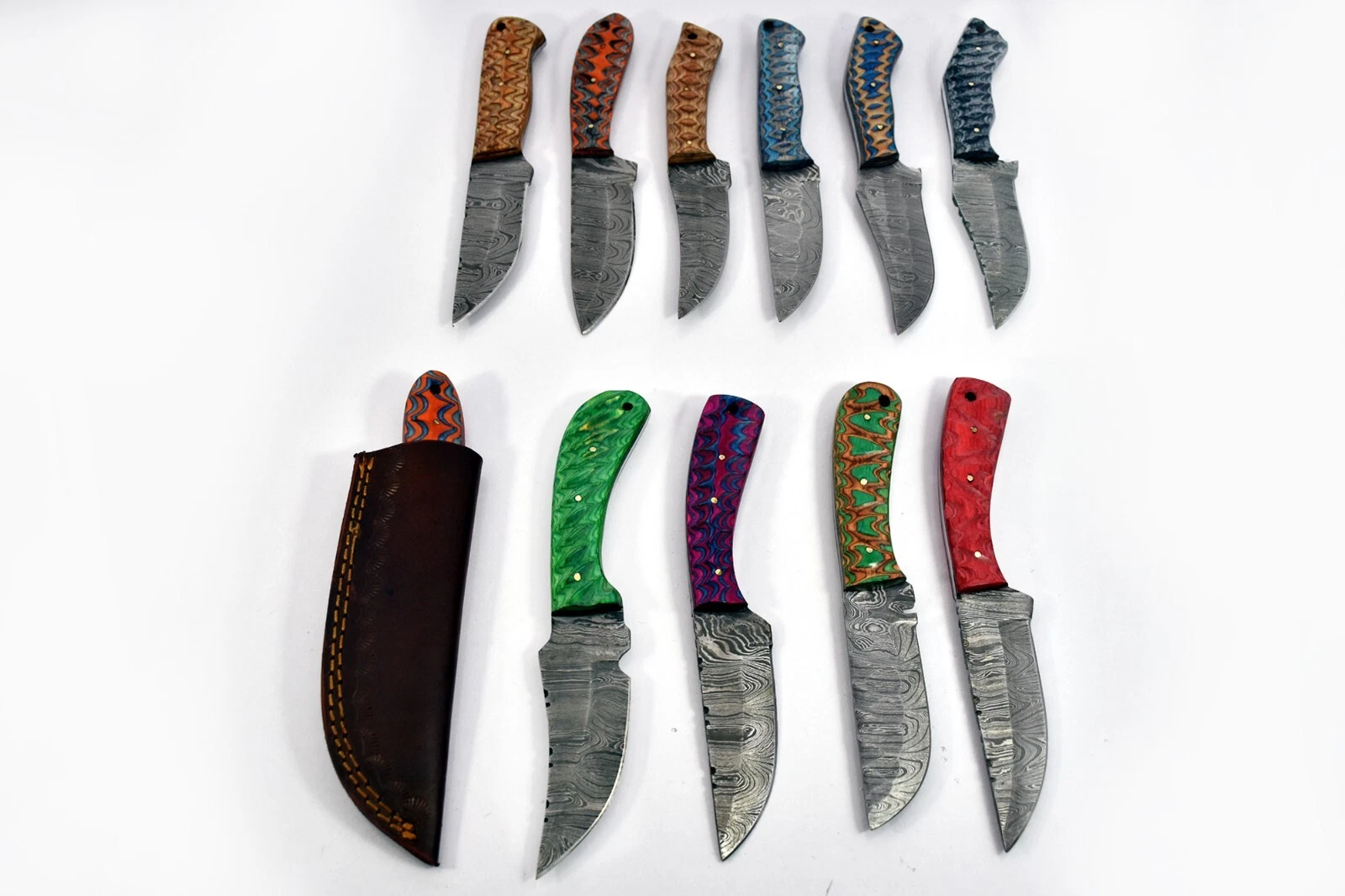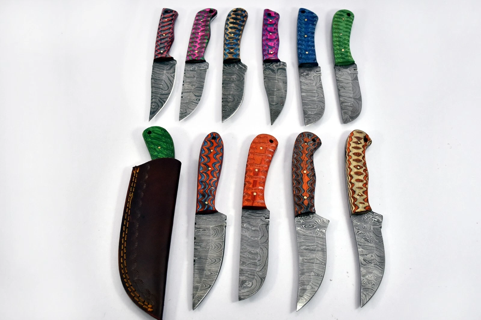 20 pieces Damascus steel fixed blade skinning knives lot with Leather sheath. Over 150 inches long Damascus steel knives in assorted colors