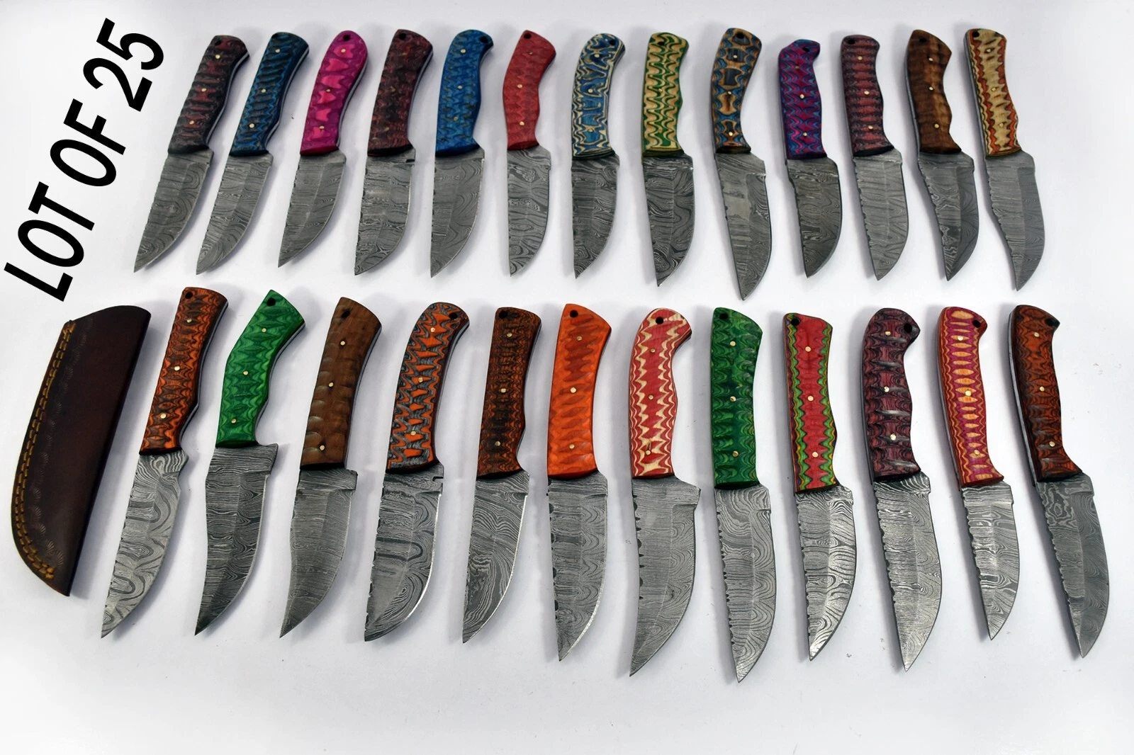 25 pieces Damascus steel fixed blade skinning knives lot with Leather sheath. Over 200 inches long Damascus steel knives in assorted colors (Copy)